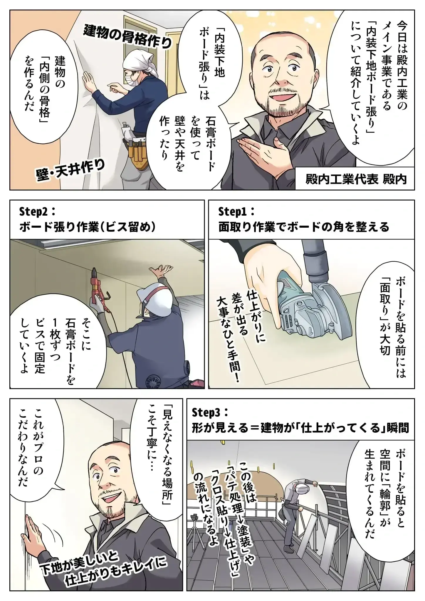 殿内工業は、30年以上にわたり内装下地工事・ボード貼り工事を専門に手がけてきた会社です。